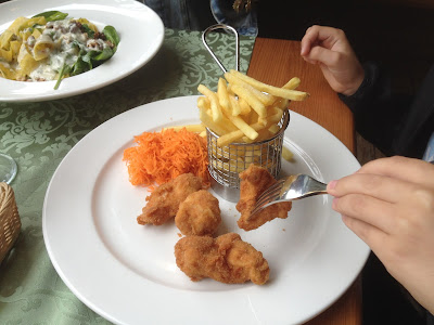 Jan stwierdził, że frytki są dziwne! Tak naprawdę były już letnie gdy je podano. Kurczaczek, niby nuggets miał smak tłuszczu i to był jedyny smak... Ale za to marcheweczka była smaczna, choć Janek ją porzucił... Ale brawa dla niego bo dzielnie zjadł prawie całą porcję!