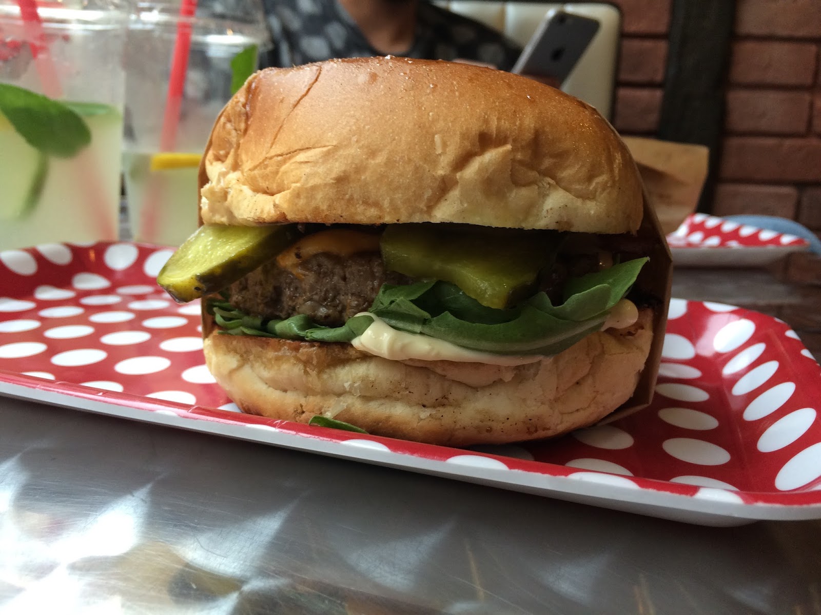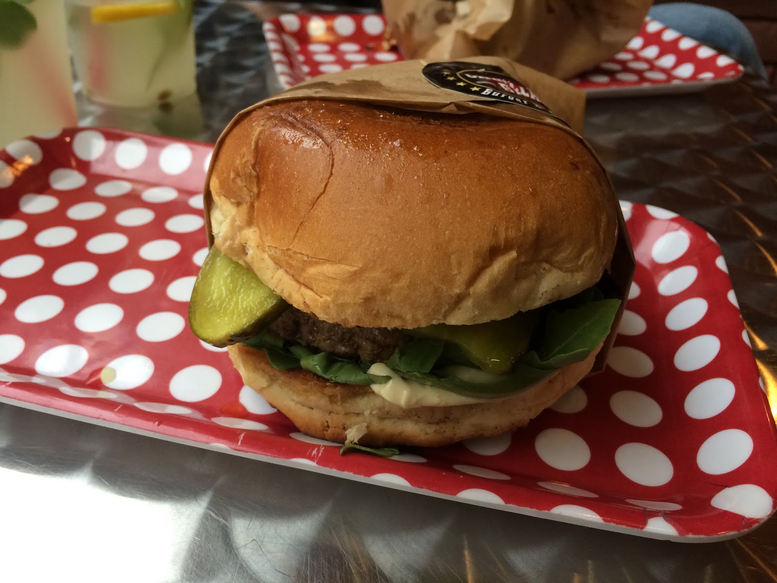 Zacznę od klasyki, czyli mojego burgera numer (burger nr brzmi trochę jak z "Idź na całość"). Mimo, że numerki burgera kojarzą mi się z polsatowskim programem, to mój burger nie okazał się totalnym zonkiem, choć też nie była to najlepsza bramka. Jeśli chodzi o dodatki to nie mam się czego przyczepić, pikle super, sos z masła orzechowego smaczny i rukola świeżynka. Jedynie ser wzbudzał moje wątpliwości, ale nie jestem w stanie wyczuć czy był to topiony w plastrach czy nie (choć bardziej jednak jestem skłonna powiedzieć, że jednak topiony). Bułka niestety nie smakowała jak własny wyrób, a przy takiej ilości burgerni w mieście homemade bułka to raczej podstawa.