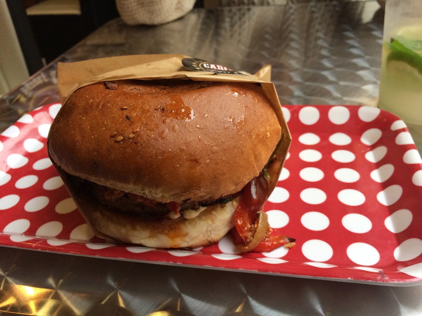W menu knajpki możecie znaleźć 6 różnych burgerów, hot-dogi i zapiekanki. My jak to przystało na wielbicieli dobrze zrobionej krowy zdecydowaliśmy się na burgera, tym bardziej, że Cadillac ogłasza się jako miejsce gdzie burgery są tak duże, że w dłoni się nie mieszczą. Żeby sprawdzić czy faktycznie są takie ogromne zamówiliśmy numer 4 (wołowina, rukola, bekon, pikle, ser, sos z masła orzechowego i kukurydzy) i numer 5 (wołowina, rukola, grillowane warzywa, ser bałkański, sos bbq pesto z suszonych pomidorów). Jak widzicie, jeden klasyk i jedno miniszaleństwo.