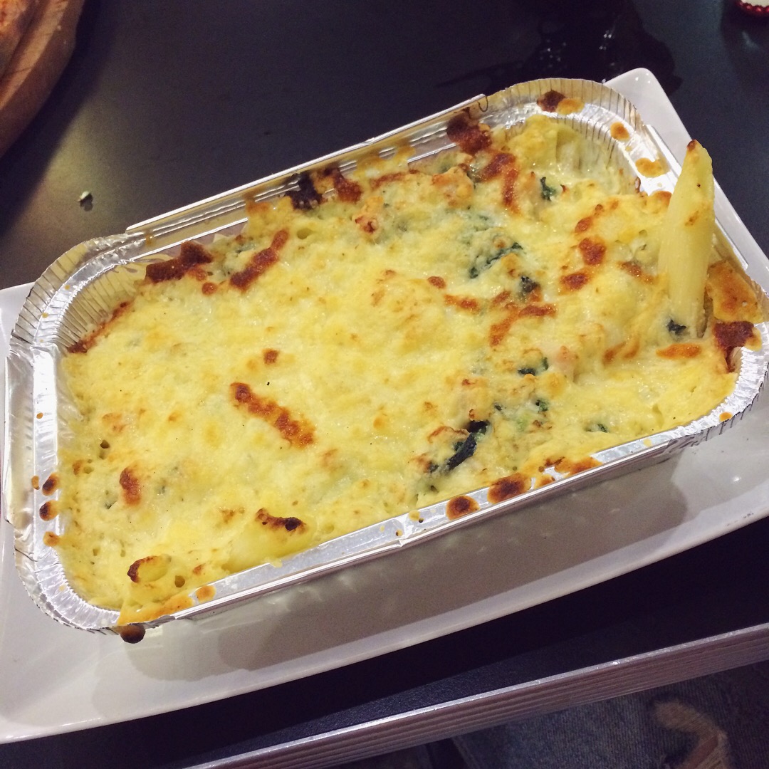 Pizzy nie zamówiłam bo w głowie miałam nadal te pyszną z Barzzy, ale skusiłam się na makaron ze szpinakiem, kurczakiem i niebieskim serem, na bogato zapiekany pod żółtym serem.