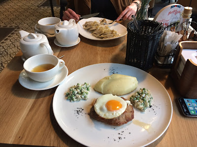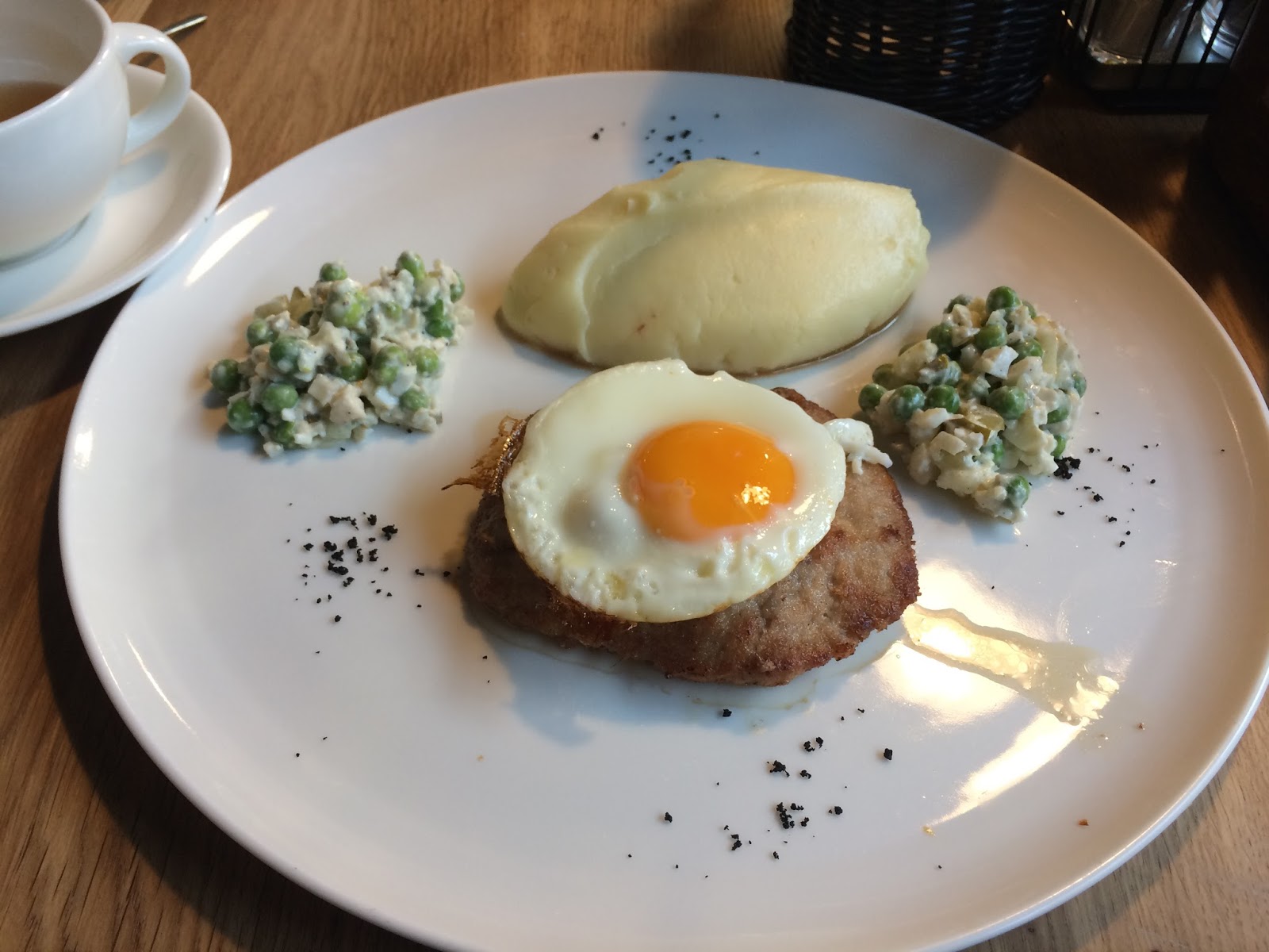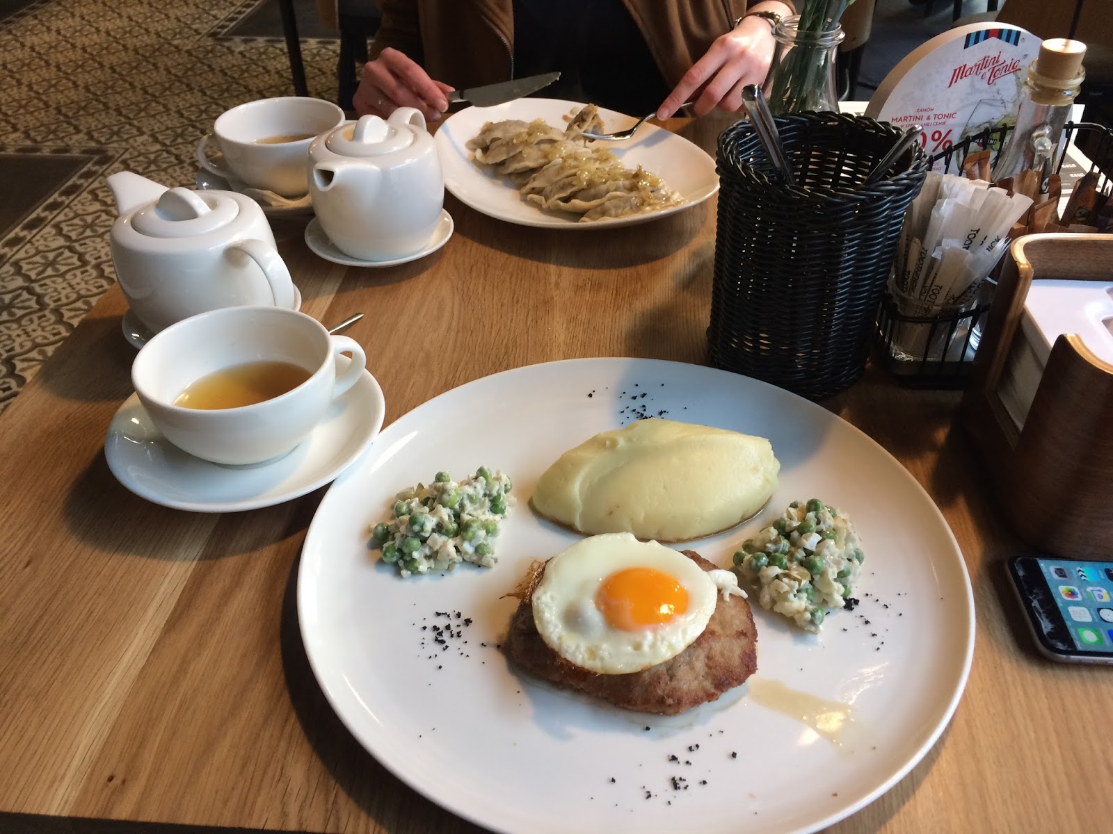 Sznycel. To danie jadł M. ja miałam okazję tylko go popróbować i cieszę się, że jednak go nie zamówiłam. M. stwierdza, że sznycel był ok, mógł być trochę bardziej doprawiony, puree ziemniaczane z cytryną było czymś nowym i przez chwilę musieliśmy się zastanowić czy w środku jest cytryna czy kwaśna śmietana. Sos tatarski w wykonaniu tej restauracji, okazał się według mnie najlepszym elementem tego dania, naprawdę był niezły. Jajko jak dla mnie trochę za surowe, ale M. nie narzekał, a w końcu to było jego danie.