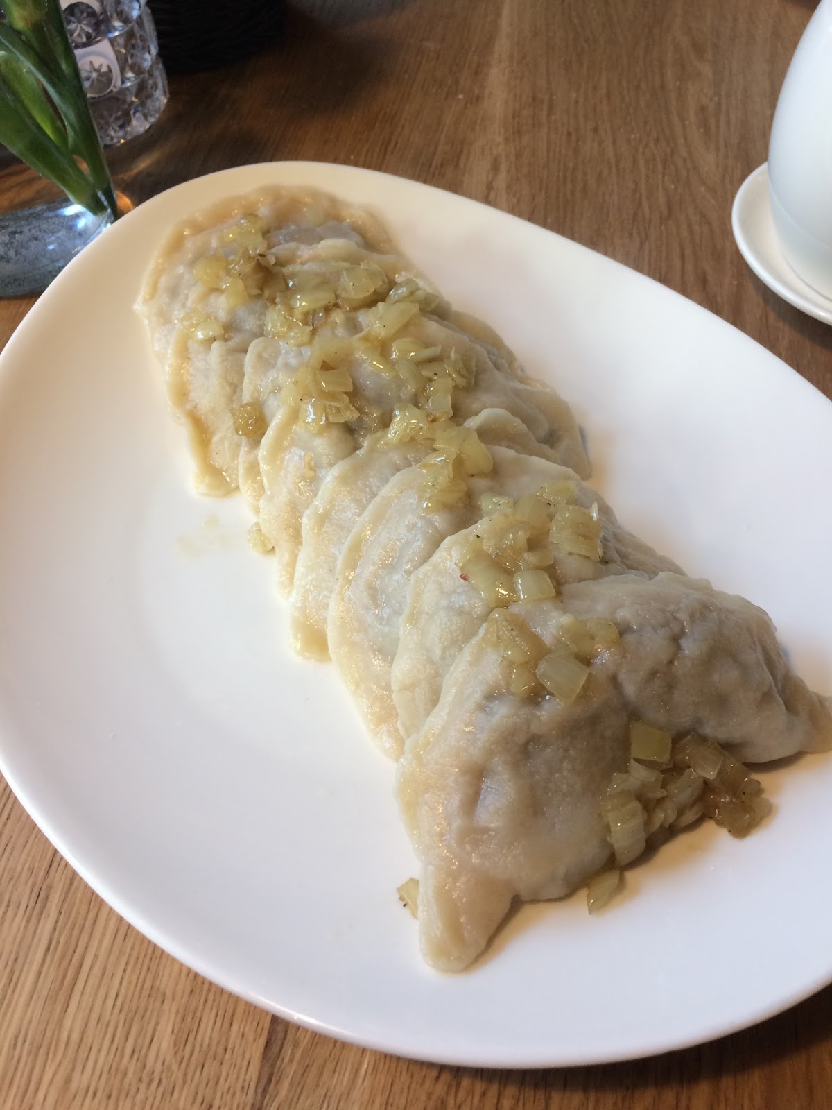 Pierogi. Smakowały tak dobrze jak te, które robi moja siostra, ale nie tak dobrze jak te, które robi moja przyszła teściowa. Były bardzo, bardzo ok. Dobrze doprawione, ciasto było cienkie, a porcja na tyle duża, że jeszcze M. się na jednego załapał. Ogólnie 4+!