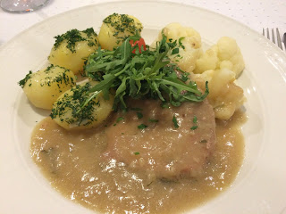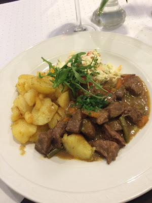 Z 3 daniowej oferty nasz wybór padł na gulasz wołowy z pieczonymi ziemniakami i bitki w sosie cebulowym.