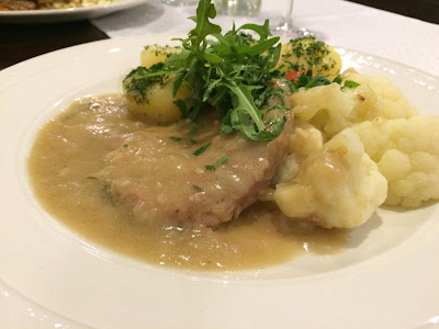 Bitki ze schabu to też była dobrze zaśpiewana aria. Sos cebulowy był cudeńkiem i idealnie pasował do kruchego i niewysuszonego schabu. I tutaj tez popłyną peany na temat ziemniaków, bo były to naprawdę dobrej jakości ziemniaki z wody... takich już w knajpach często nie mają. Całość dopełniał ugotowany w punkt, świeży kalafior.