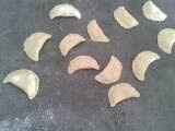 - Ciasto na pierogi wałkujemy do grubości 2 cm, wycinamy kółka i nadziewamy je farszem. Następnie zlepiamy.