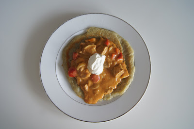 - Smażymy placki. Na usmażone placki nakładamy sos i dekorujemy kleksem z kwaśnej śmietany.