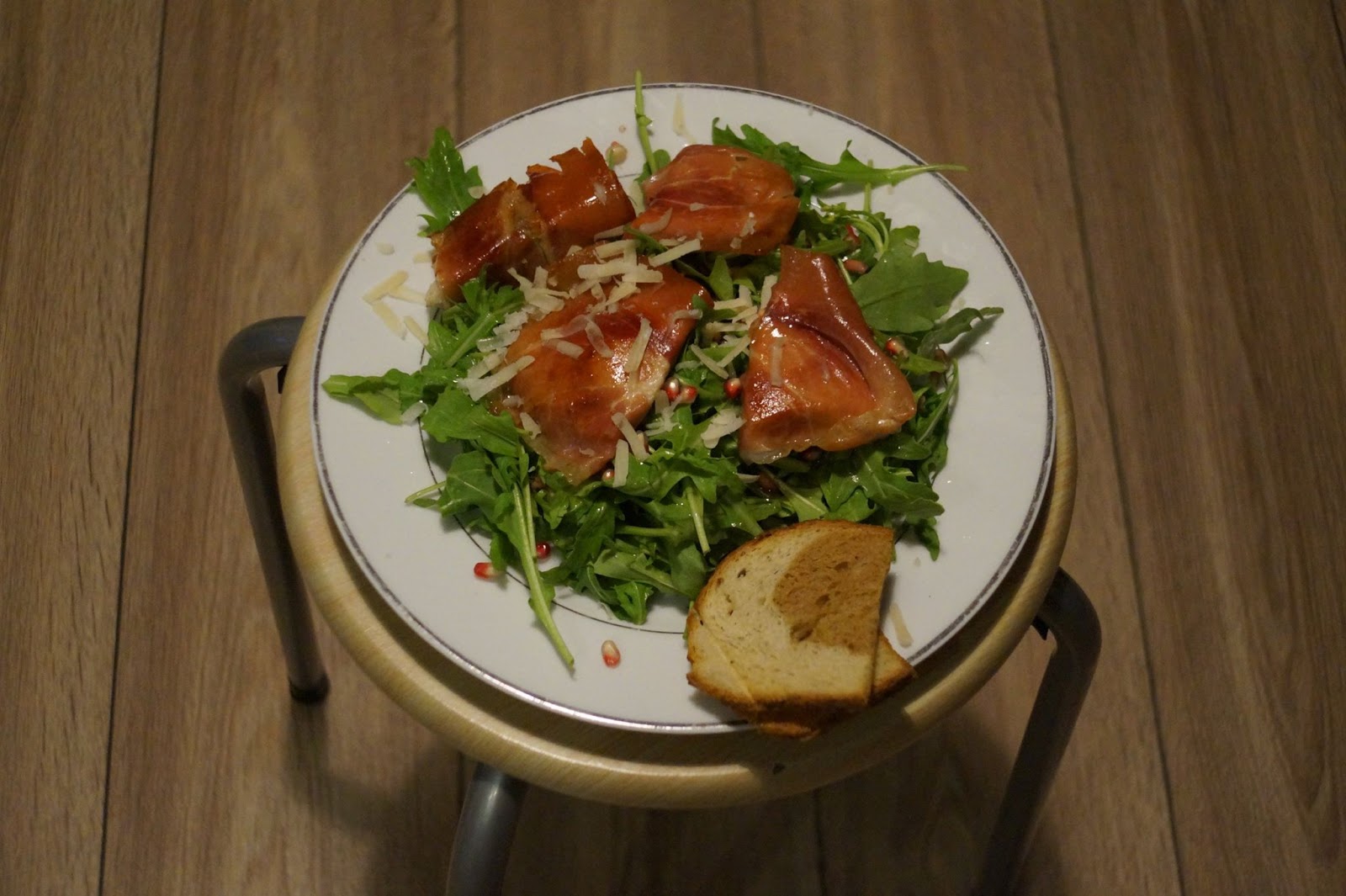 - Rukole oczyszczamy, układamy na talerzu, polewamy dressingiem, posypujemy granatem, a na samej górze układamy kurczaka i posypujemy startym parmezanem. Całość podajemy z grzankami.
