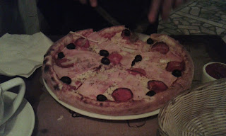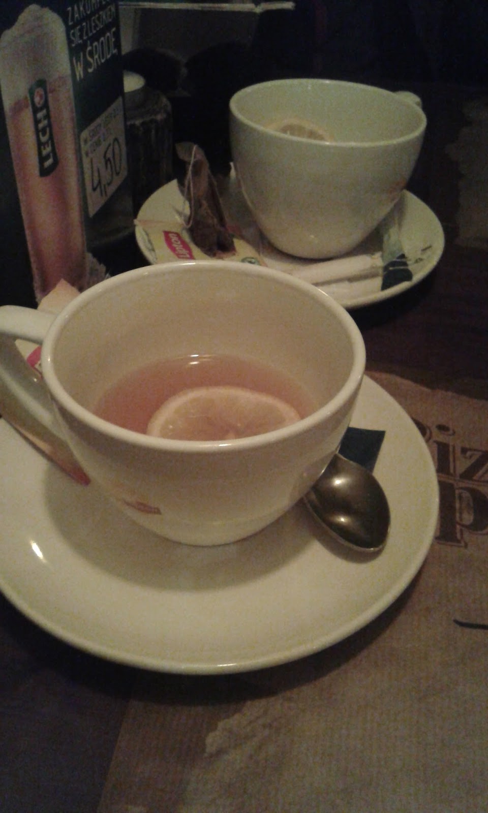 Po dogłębnej analizie menu zamówiliśmy pizze z pepperoni oliwkami i szynką i calzone z szynką i pieczarkami no i herbatę. Po otrzymaniu herbaty czkało nas dłuuuuugie czekanie na jedzenie. Najgorsze, że nikt nas nie uprzedził, że tyle to będzie trwać... Po jakiś 25-30 minutach, kiedy to inne stoliki powoli zaczęły dostawać swoje dania my nadal siedzieliśmy tylko przy herbacie. Ale w końcu zjawiła się pani kelnerka i powiedziała, że musimy poczekać jeszcze 15 minut (o zgrozo!)