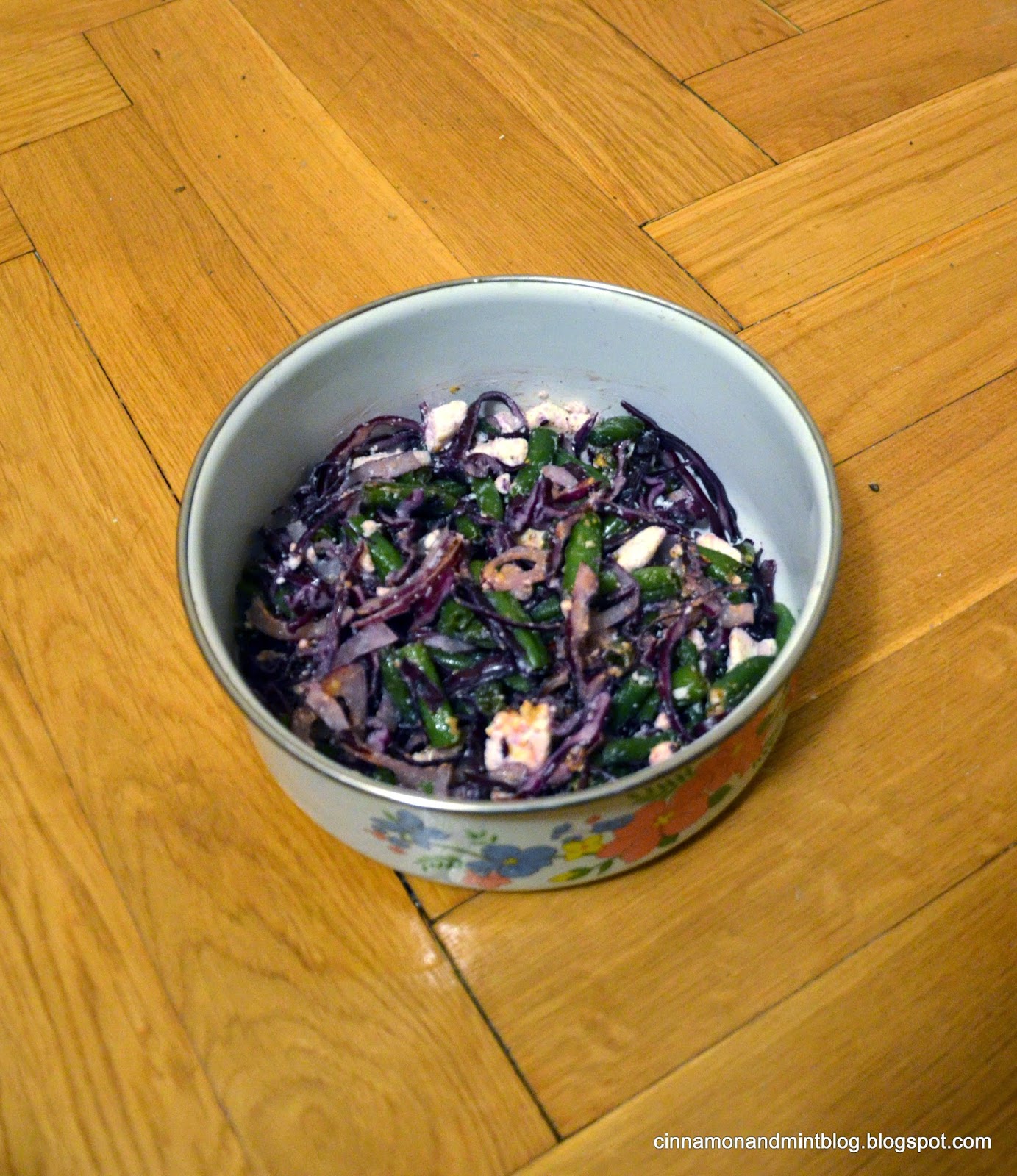 Na czerwoną kapustę muszę mieć szczególną ochotę. I tak było ostatnio. Zrobiłam moją ulubioną surówkę z kapusty, marchewki i jabłka, no i oczywiście z ogromną ilością pietruszki. Problem w tym, że została mi prawie cała główka. I tu wykorzystałam moją kreatywność (a właściwie jej resztki - po 8 godzinach pracy) i zrobiłam naprawdę smaczną surówkę. Byłam tym faktem tak zaskoczona, że zjadłam całą na kolację i jedyne zdjęcia jakie posiadam nie powalają :) Ale mogę z całą pewnością powiedzieć, że jest to jedno z tych dań, które smakują lepiej niż wyglądają.
