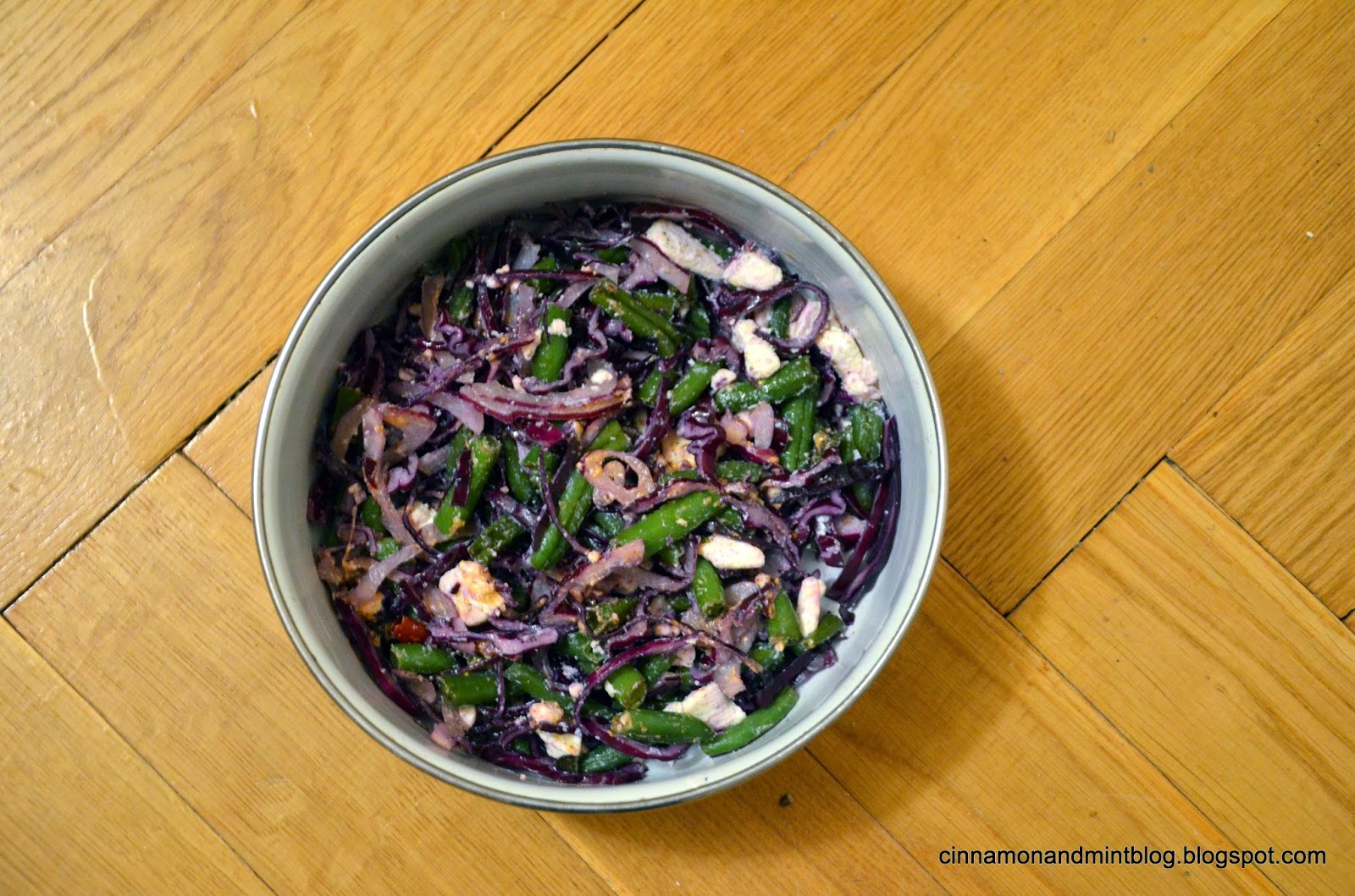 Kapustę kroję drobno, zasypuję lekko solą (żeby zmiękła). Fasolkę podsmażam na oliwie z czosnkiem. Gdy ostygnie, mieszam wszystkie składniki.