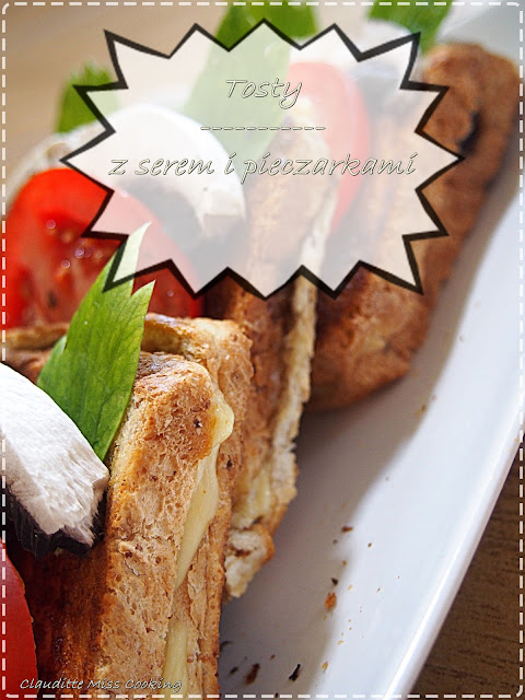 Przygotowanie:Na trzech kromkach pieczywa rozsmarować kremowy serek topiony, następnie po 2 plasterki sera Gouda oraz po 3 plasterki pieczarek. Przykryć pozostałymi kromkami chleba. Każdą kanapkę posmarować masłem po dwóch zewnętrznych stronach. Smażyć na patelni, na średnim ogniu, aż się zarumienią, a ser w środku będzie ciągnący. Podpieczoną kanapkę wyłożyć na talerz, a na górze położyć lubczyk, pieczarkę i pomidorka.
