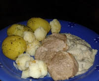 na sklarowanym maśle połączonym z olejem, 2 - 3 cm z każdej strony. Usmażone polędwiczki przełożyłam na talerz, który przykryłam folią aluminiową, aby odpoczęło. Całe "dobro" jakie pozostało na patelni trzeba było zebrać. W związku z tym drobno pokroiłam cebulkę i przesmażyłam na patelni, następnie pokroiłam pieczarki, które dołożyłam do cebulki. Posoliłam delikatnie. Pieczarki puściły sok i dolałam śmietanę, która zagęściła sos. Na koniec doprawiłam jeszcze solą i pieprzem jeżeli zaistniała taka konieczność.