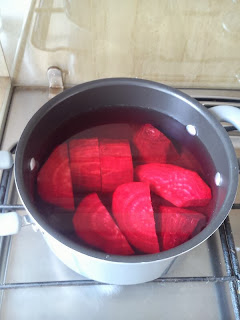 Myjemy, obieramy i kroimy buraki, później gotujemy aby zmiękły.