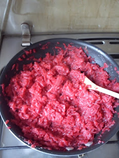 Ugotowane i miękkie buraczki, trzemy na tarce i wrzucamy na patelnię - smażymy na maśle.