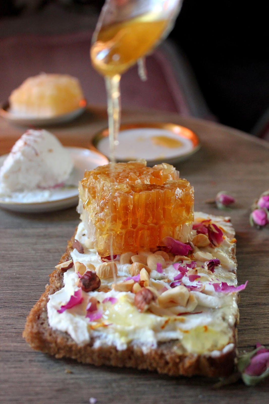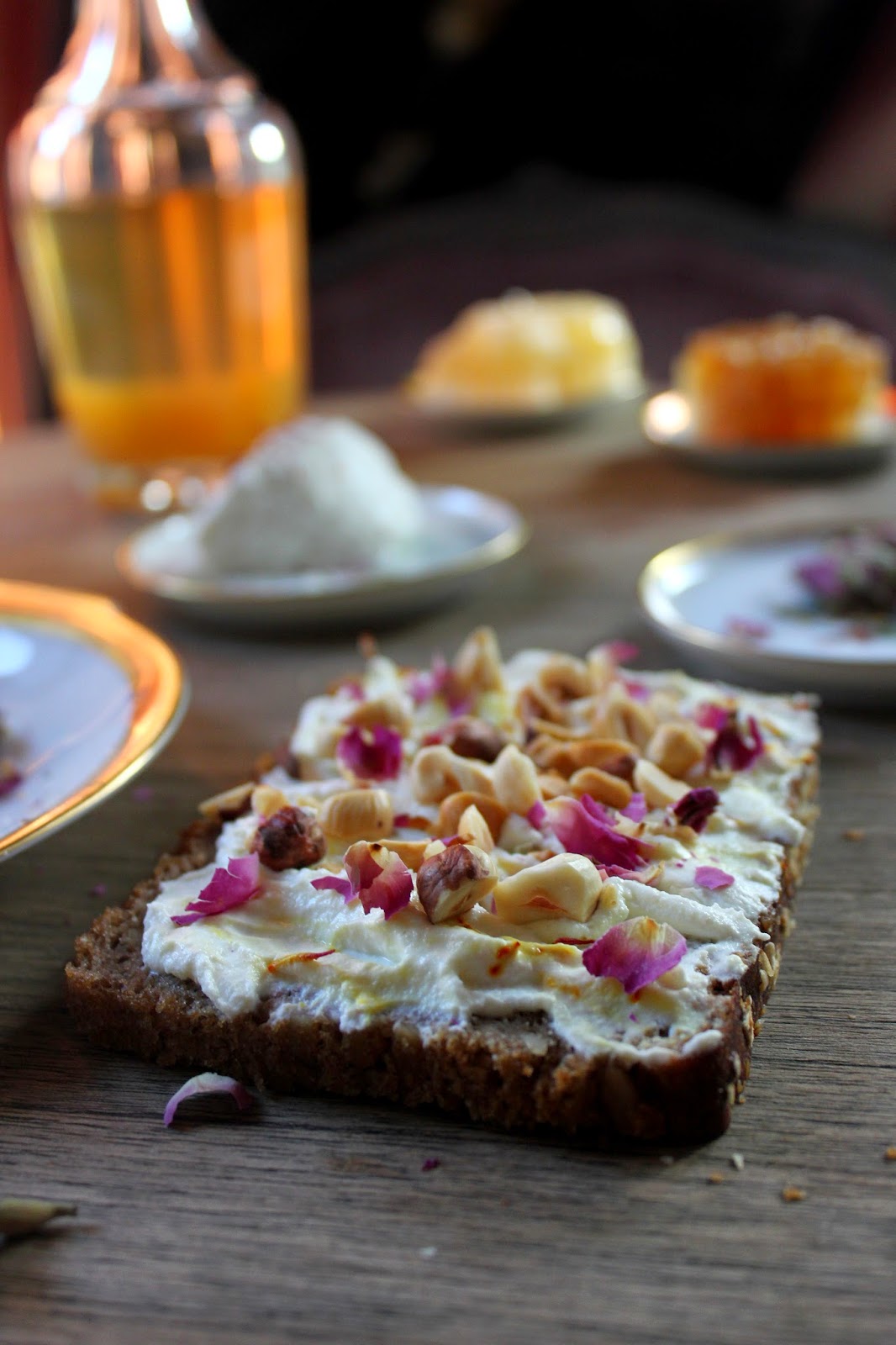- Kromki chleba posmaruj szafranową ricottą( możesz posmarować wcześniej masłem), posyp orzechami, płatkami róży, skrop miodem