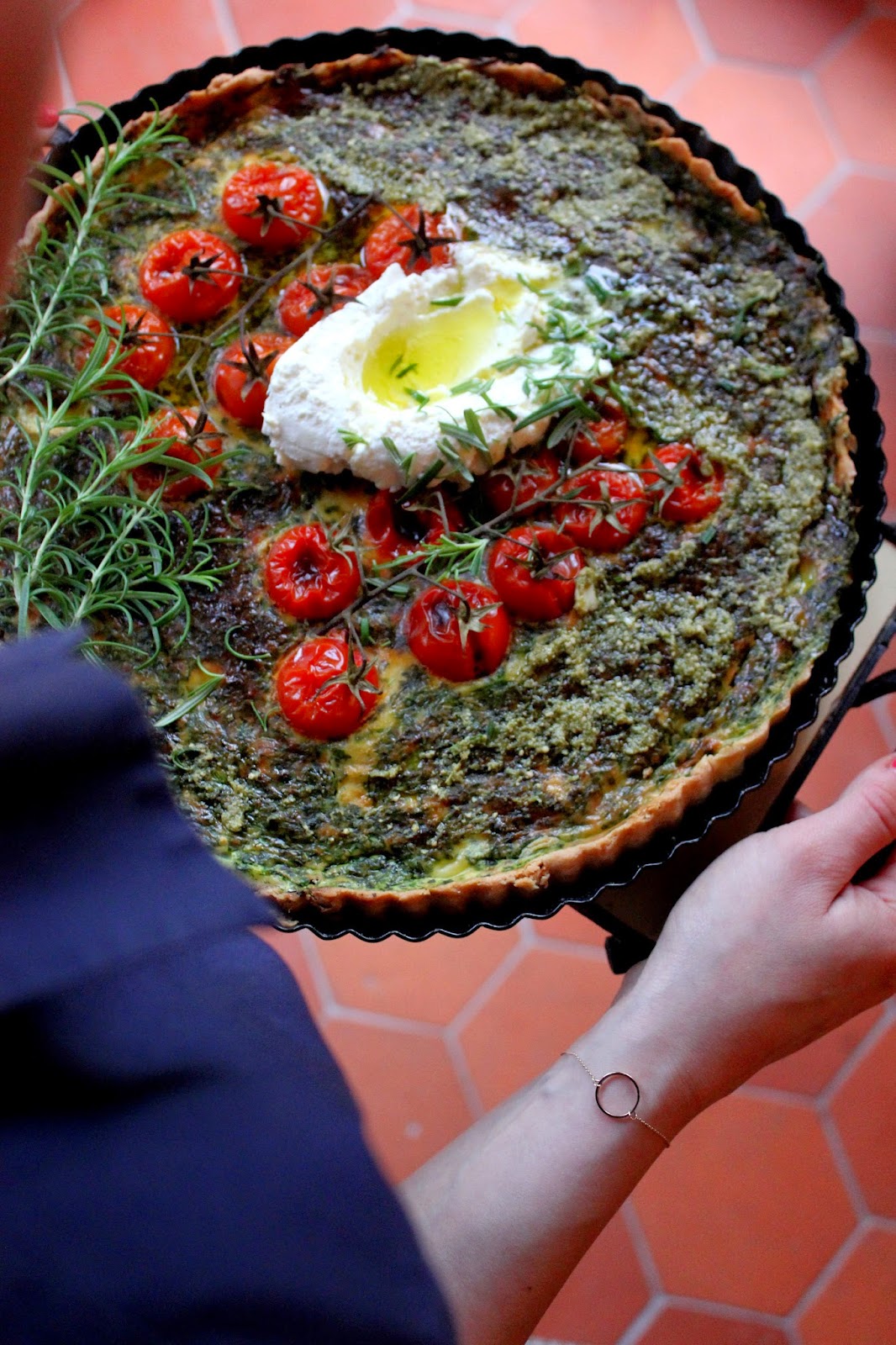 Ci z Was, którzy mają naszą książkę "Artystyczne smaki z miłości do kuchni" znają już quiche z boczkiem, selerem i jabłkami, teraz przyszedł czas na jej wiosenną wersję. Dzisiaj upiekłyśmy przepyszną tartę bazyliową z zapieczonymi gałązkami drobniutkich pomidorków czereśniowych. Quiche jest bardzo delikatna, pięknie seledynowa od ogromnej ilości skrojonej bazylii. Zapieczone pomidorki, odrobinę winne, znakomicie ożywiają jej smak, a duża ilość jaj nadaje jej lekkości. Świetna na gorąco, równie dobra na zimno.