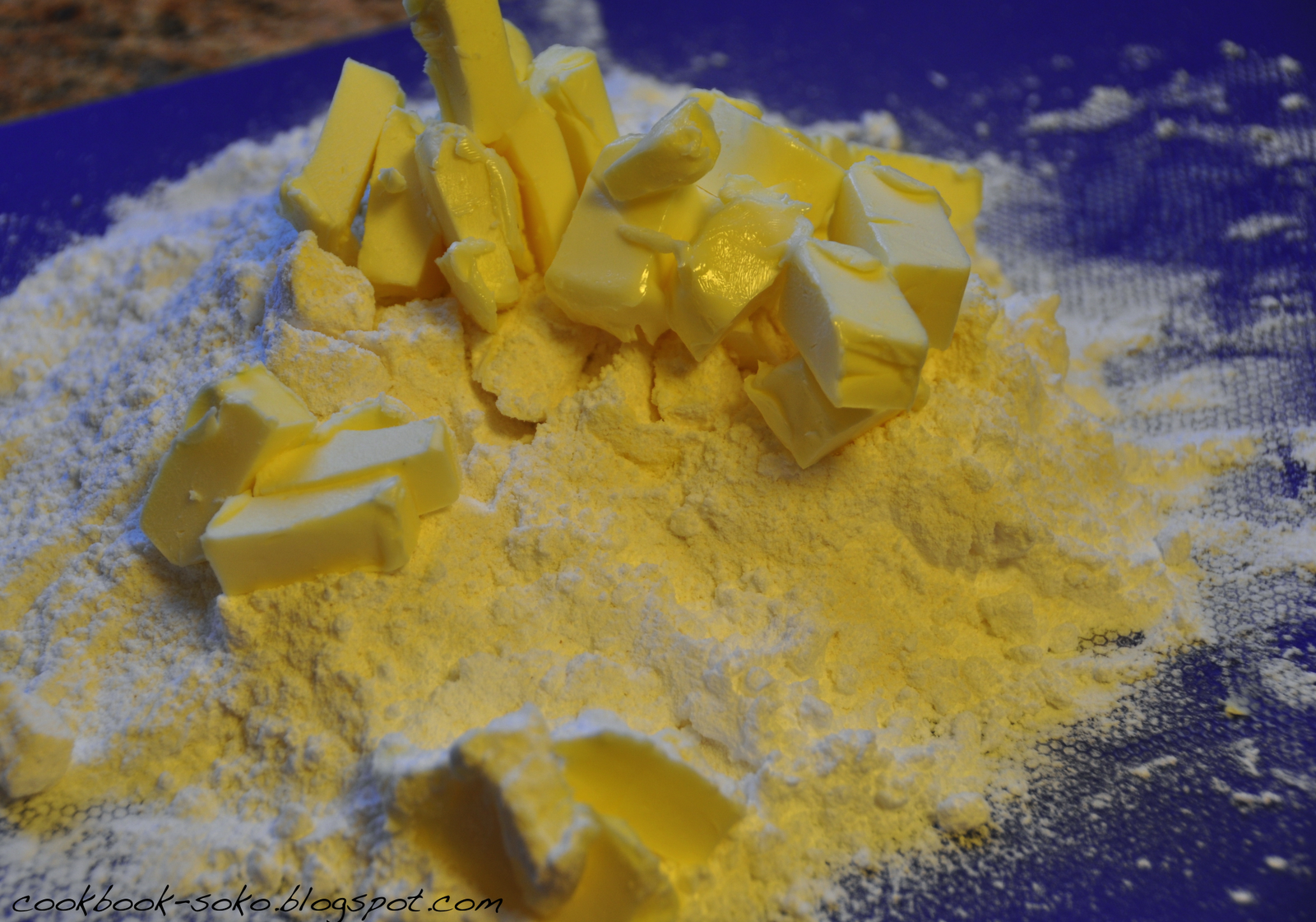 1. przesianą mąkę wymieszać z cukrem pudrem i dodać pokrojone w kostkę masło, wszystko razem dość dokładnie pokroić nożem