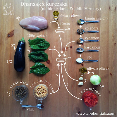 pierś z kurczakakumin mielonykolendracynamonkardamonsól2 ząbki czosnkucebula2 szklanki pomidorów z puszki1/2 bakłażana150g szpinaku1/2 szklanki soczewicy z puszki1/2 szklanki ciecierzycy z puszki oliwa z oliwek