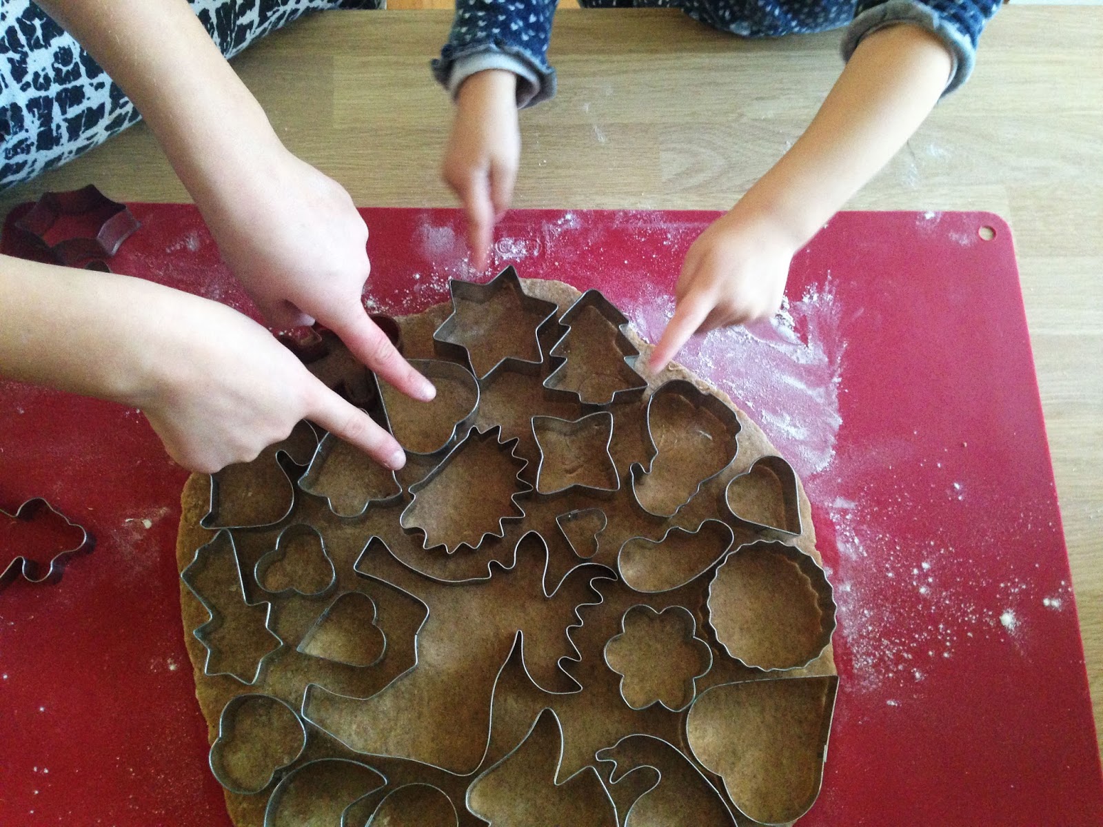 3. Rozwałkuj ciasto lekko podsypując mąką i najlepiej za pomocą dzieci i foremek stwórz najfajniejsze pierniczki świata