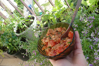 (jedna mała wystarczyła)Przygotowanie:Kuskus zalewamy szklanką gorącej wody, pozostawiamy by napęczniał. W tym czasie myjemy i drobno kroimy papryczkę, dymki, natkę i miętę. Pomidory kroimy w małą kostkę (można je wcześniej sparzyć i zdjąć skórkę ale ja nie lubię takich, mają zupełnie inny smak :/). Napęczniałą kaszę łączymy z koncentratem pomidorowym, przyprawiamy solą, pieprzem, kminem i papryką. Mieszamy, wrzucamy zieleninę, dymki i pepperoni. Na koniec dodajemy pomidory, wlewamy oliwę i sok z cytryny. Mieszamy jeszcze raz, odstawiamy do lodówki na 30 minut.