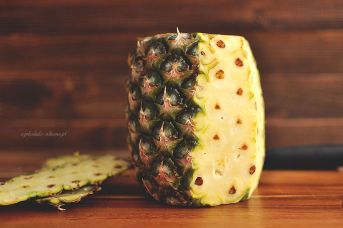 3. Ananasa kroimy ostrym nożem na bardzo cieniutkie kawałki.