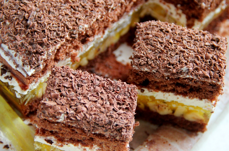 Galaretki rozpuścić w 3 szklankach wrzątku, odstawić do całkowitego ostygnięcia. Gdy galaretka zacznie lekko tężeć obrać banany ze skórki, pokroić i skropić sokiem z cytryny. Ułożyć je ciasno na jednej części ciasta, jeden obok drugiego. Następnie zalać tężejącą galaretką i wstawić do lodówki, by galaretka całkiem zastygła.