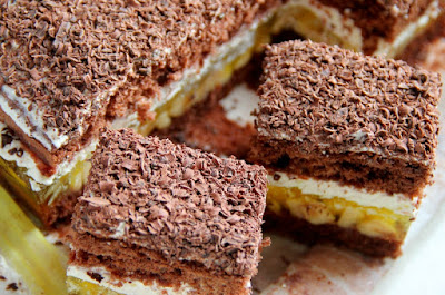 Wyłożyć 3/4 kremu i przykryć drugim blatem ciasta, który też smarujemy marmoladą i tą stroną składamy z kremem. Na wierzchu rozsmarować resztę kremu, posypać startą czekoladą. Wstawić  do lodówki.