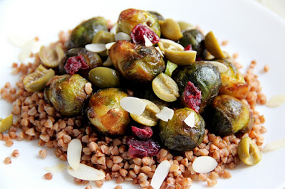 Na talerz wyłóż kaszę, na to brukselki, z sosem, posyp oliwkami, żurawiną i migdałami.