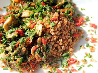 Kaszę ugotuj na sypko. Zmiażdż czosnek, pokrój pomidory i grzyby, wrzuć na patelnię, dopraw solą i pieprzem. Dodaj szpinak i podsmaż przez chwilę, dodaj kaszę i jagody goi. podawaj ze szczypiorkiem ;)