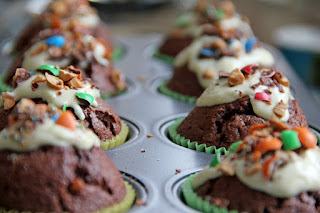 Wierzch babeczek udekorowałam rozpuszczoną białą czekoladą i pokrojonymi kuleczkami m&m (orzeszki w czekoladzie)