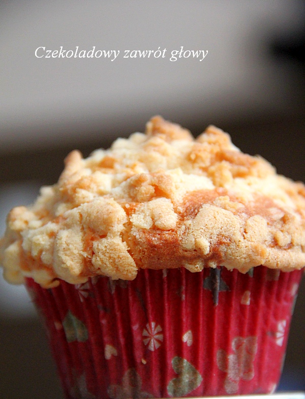 Powstałą masą wypełnić foremki do babeczek umieszczone w foremce metalowej, na każdą babeczkę nałożyć kruszonkę startą na tarce o grubych oczkach, lub rozkruszoną palcami.