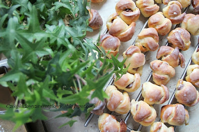 Dzisiaj , kiedy pada deszcz nic nie można zrobić lepszego jak spędzić czas w kuchni i rozpieścić bliskich czymś do popołudniowej kawki. Stąd rogaliki drożdżowe ... z nutellą bo tak chciały dzieciaki, ale są bardzo delikatne, puszyste i smaczne.