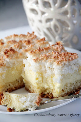 W tym czasie z białek ubić pianę, dodać 1/2 szklanki cukru i 200 g kokosu. Masę kokosową wyłożyć na sernik po 40-45 minutach pieczenia i dalej piec przez kolejne 15 minut.