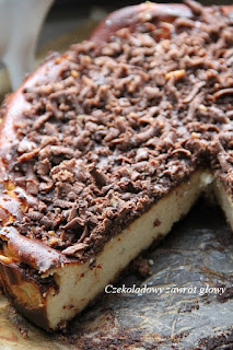 Wylewamy na michaszkowy spód, który był w lodówce i wstawiamy do piekarnika nagrzanego do 180 stopni i pieczemy 50 minut. PO tym czasie wyłączamy piekarnik i uchylamy drzwiczki, pozostawiając ciasto jeszcze w środku. Po pół godzinie studzimy na kratce, ścierając na grubych oczkach drugą połowę cukierków.