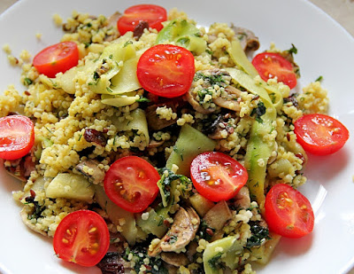 Kasze ugotuj al dente, pieczarki pokrój i podsmaż na patelni z czosnkiem, cukinią i natką pietruszki, dodaj kaszę , ziarna siemienia, sezamu oraz przyprawy. Wymieszaj, przełóż na talerz i pokrój kilka pomidorków koktajlowych i dodaj do dania.