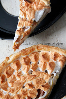 Dzisiaj poniedziałek, dzień i tydzień trzeba zacząć dobrze, więc najlepiej z czymś słodkim, w lodówce zalega ciasto francuskie, więc może się przyda, jabłka już trochę zmęczone są, to kupimy nowe, a w trakcie przygotowywanie jeszcze dodałam mięciutką białkową pierzynkę. Wszystko to improwizacja, smakuje dobrze, słodko, chrupiącą i mięciutko. Polecam - taka szybka alternatywa, na poprawienie humoru. :)