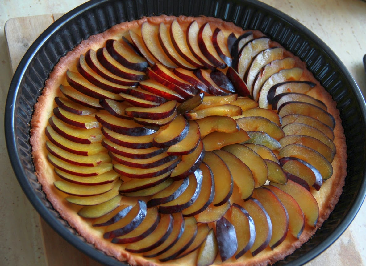 Wyjmujemy ciasto z piekarnika i na kruche ciasto wykładamy koncentrycznie, nakładające się na siebie plasterki śliwek, które oprószamy cynamonem. Na śliwki wylewamy masę serową.