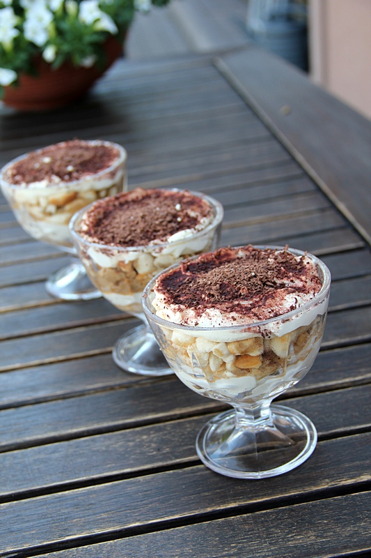 Biszkopty mielimy , ubijamy śmietanę, dodajemy cukier puder, dodajemy mascarpone, zaparzamy kawę. W pucharku układamy część biszkoptów, polewamy łyżką kawy, lub dwiema, nakładamy masę mascarpone, znowu wykładamy biszkoptu, oblewamy kawą i znowu masa mascarpone. Wierzch oprószamy kakao, lub startą czekoladą.