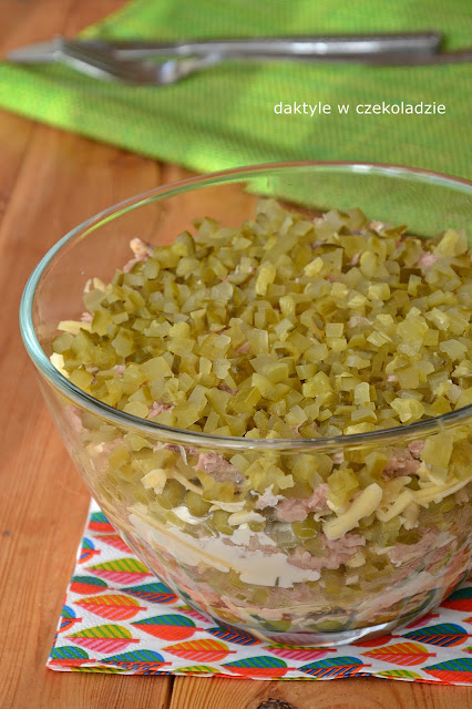 Warstwowa sałatka z tuńczykiem, zielonym groszkiem i ogórkami kiszonymi. Może być nowością - przebojem na Waszym wielkanocnym stole :) Niby proste ale przepyszne połączenie składników!