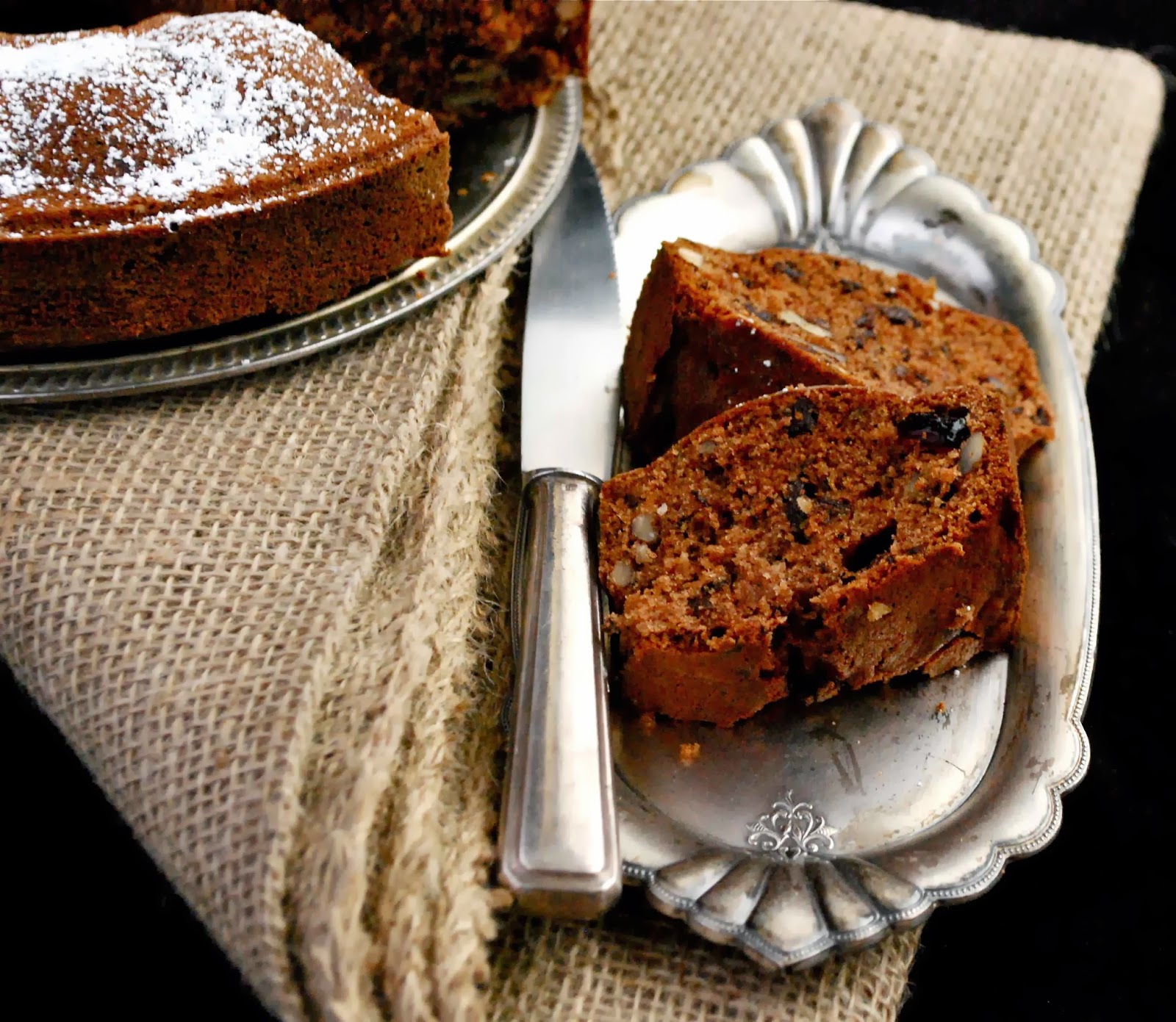 Wspaniale, korzenne ciasto z dodatkiem kakao, suszonej zurawiny, orzechow wloskich, rodzynek, gorzkiej czekolady i... musu jablkowego. Mus jest tu skladnikiem ciasta, nadaje mu miekkosci i puszystosci i nie jest raczej wyczuwalny w smaku. Ciasto smakuje podobnie jak piernik. Pachnie mielonymi gozdzikami i cynamonem. Kto sie skusi? ;) Goraco polecam.