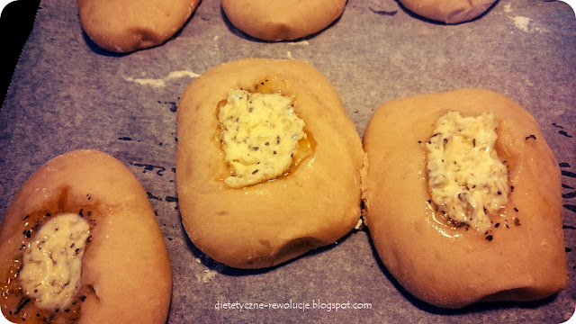 4. Po tym czasie w każdej bułeczce robimy nacięcie najlepiej łyżeczka i wkładamy masło czosnkowo ziołowe