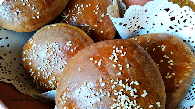 4. Gdy bułeczki trochę podrosną smarujemy wierzch białkiem, które zostało z jajka i posypujemy sezamem. Rozgrzewamy piekarnik do 200 stopni i pieczemy bułeczki około 20 minut. Odkładamy do przestygnięcia