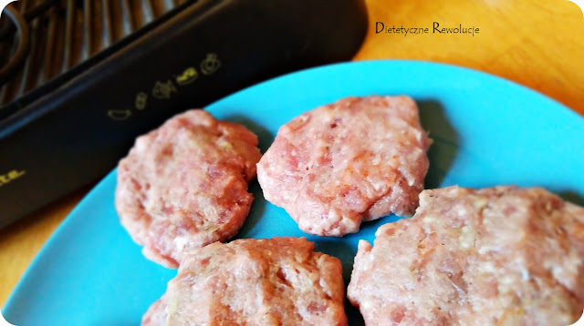 5. Rozgrzewamy grill lub patelnię grillowa. Formujemy spore kotlety i lekko spłaszczamy. Najlepiej zwilżyć dłonie zimną wodą wtedy lepiej się lepi. Grillujemy po 3 minuty z każdej strony.