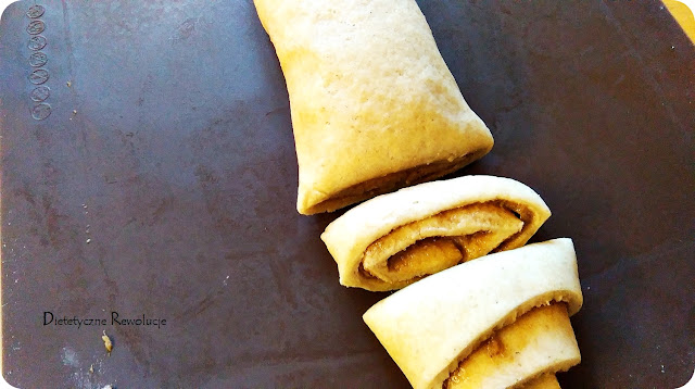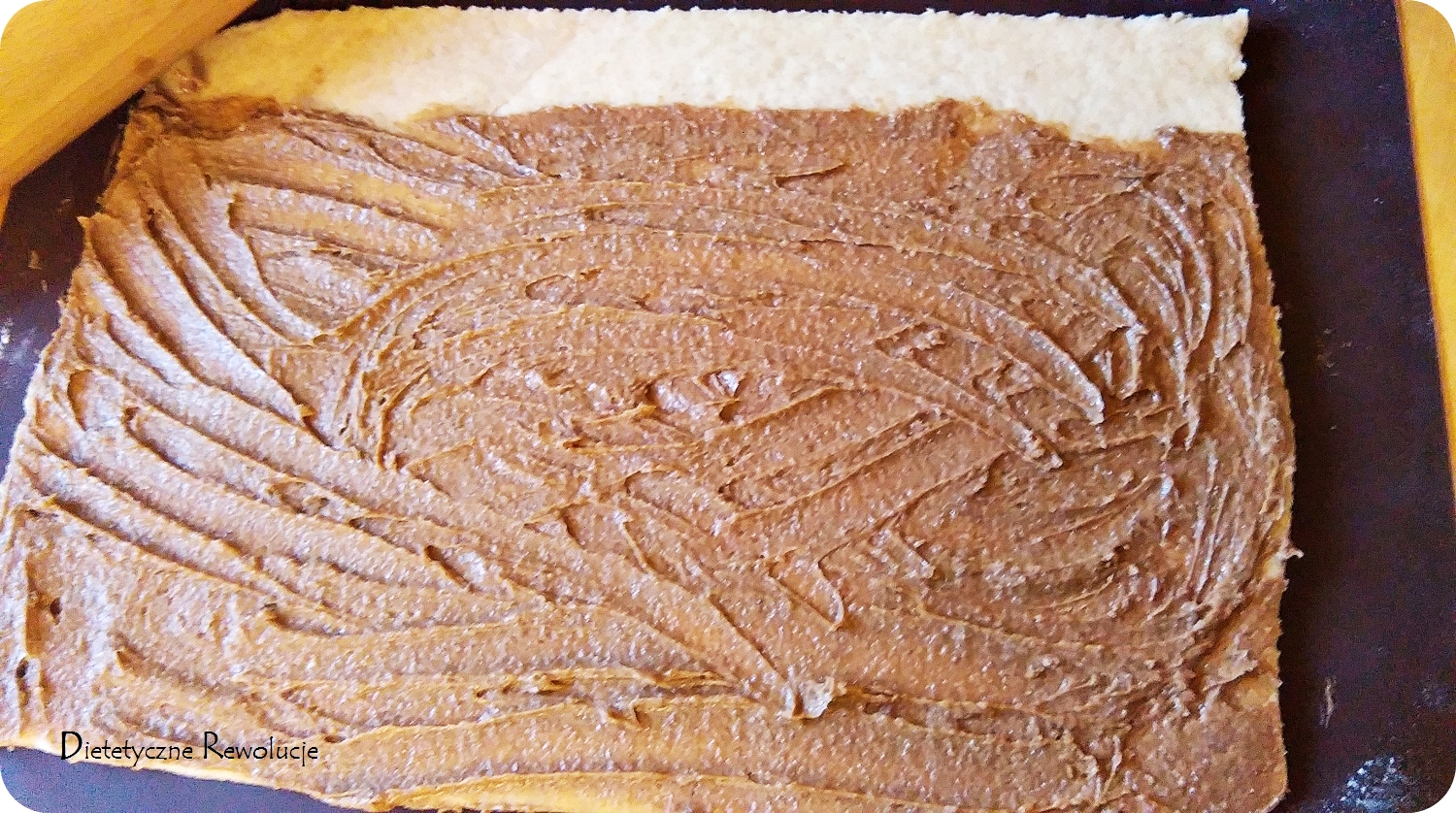 4. Ciasto należy rozwałkować na kształt prostokąta. Na całej powierzchni smarujemy masę, zostawiamy jeden dłuższy bok. Blat można podsypać mąką, bo ciasto lubi się kleić. Zwijamy jak roladę, zaczynając od tego "pustego boku". Kroimy na ok 2 cm kawałki
