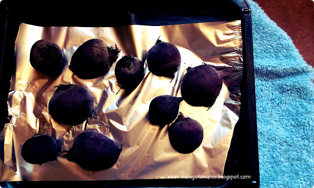 - Buraki dokładnie myjemy, układamy na blaszce do pieczenia i zawijamy w folie aluminiowa. Pieczemy w piekarniku rozgrzanym do 180 stopni ok 1,5 godz