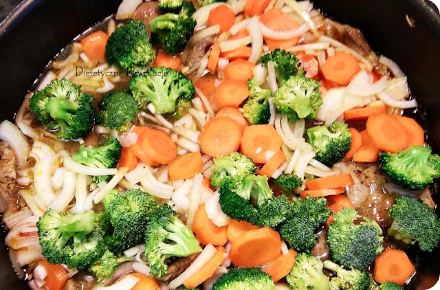 4. Po 30 minutach duszenia karkówki dodajemy warzywa i cebule pokrojone w piórka. Delikatnie mieszamy, żeby wszystko znalazło się pod wodą i przykrywamy. Dusimy jeszcze ok 1 godziny
