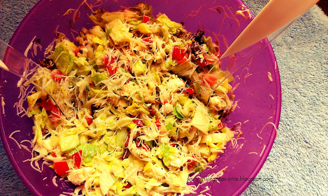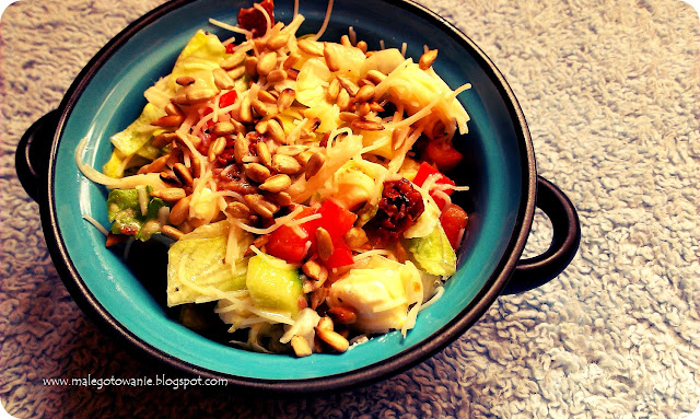 Moje dziecko bawiąc się (dla maluchów przyprawy i pudełka z kaszą są bardziej fascynujące niż nowe Lego :) ) znalazło zapomniane opakowanie makaronu ryżowego. Najczęściej używałam go do sajgonek lub dan chińskich, jednak w tamtym momencie nie miałam na nic takiego ochoty. Zajrzałam do lodówki i postanowiłam zrobić sałatkę. W końcu jestem sałatkoholiczką, muszę mieć w domu prawie codziennie jakąś.