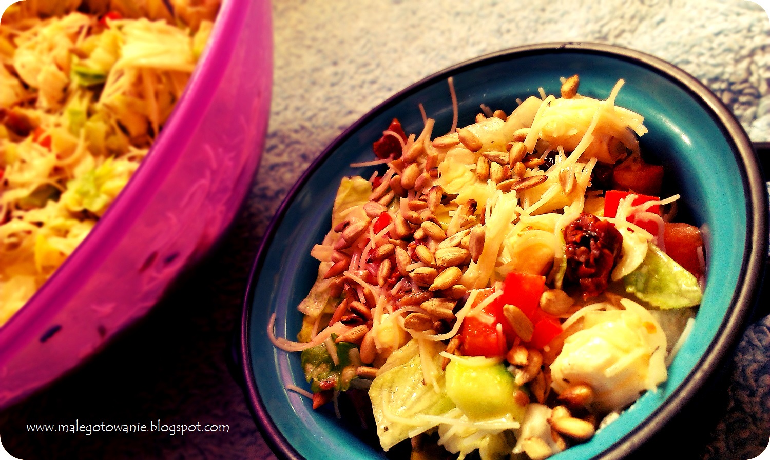 - Chłodny makaron kroimy drobno, mieszamy z reszta składników. Polewamy sosem (najlepiej przed samym podaniem). Posypujemy słonecznikiem