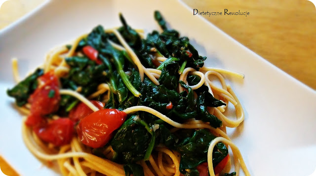 Uwielbiam oglądać programy kulinarne i czerpać inspiracje do swojej kuchni. Zawsze coś dodam, odejmę lub przekształcę pod swój smak. Wczoraj rano oglądałam "Doradce Smaku", gdzie Michel Moran zrobił cudowny makaron ze szpinakiem i pomidorkami. Potrawa była tak realistyczna, ze przez odbiornik prawie czułam jej zapach :)Postanowiłam odtworzyć dodając kilka rzeczy od siebie i powiem, ze wyszło cudownie aromatyczne i syte. Polecam!