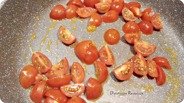 3. Na tej samej patelni rozpuszczamy znowu 1 łyżkę masła i wrzucamy pomidorki przekrojone na pół lub ćwiartki. Dodajemy oregano i mieszamy ok 2-3 min. Następnie dodajemy nasz szpinak, doprawiamy solą, pieprzem i gałką muszkatołową.